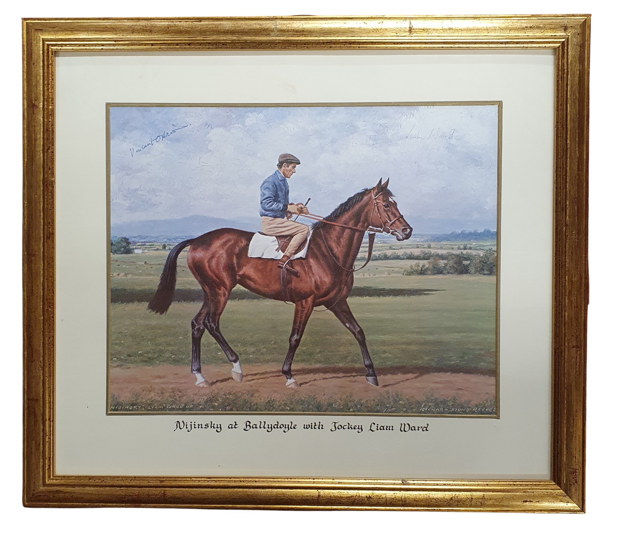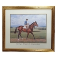 After Richard Stone Reeves, a coloured Print of Nijinsky at Ballydoyle with jockey Liam Ward from Castlesize.