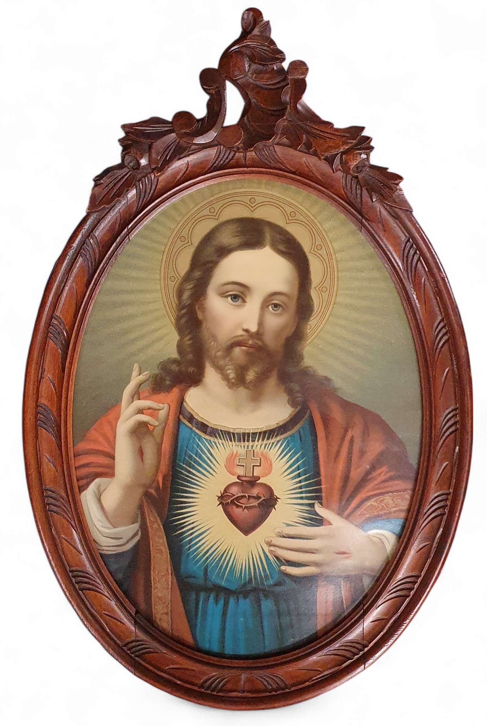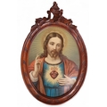 A 19th Century coloured Print of The Sacred Heart. In a good carved walnut frame.