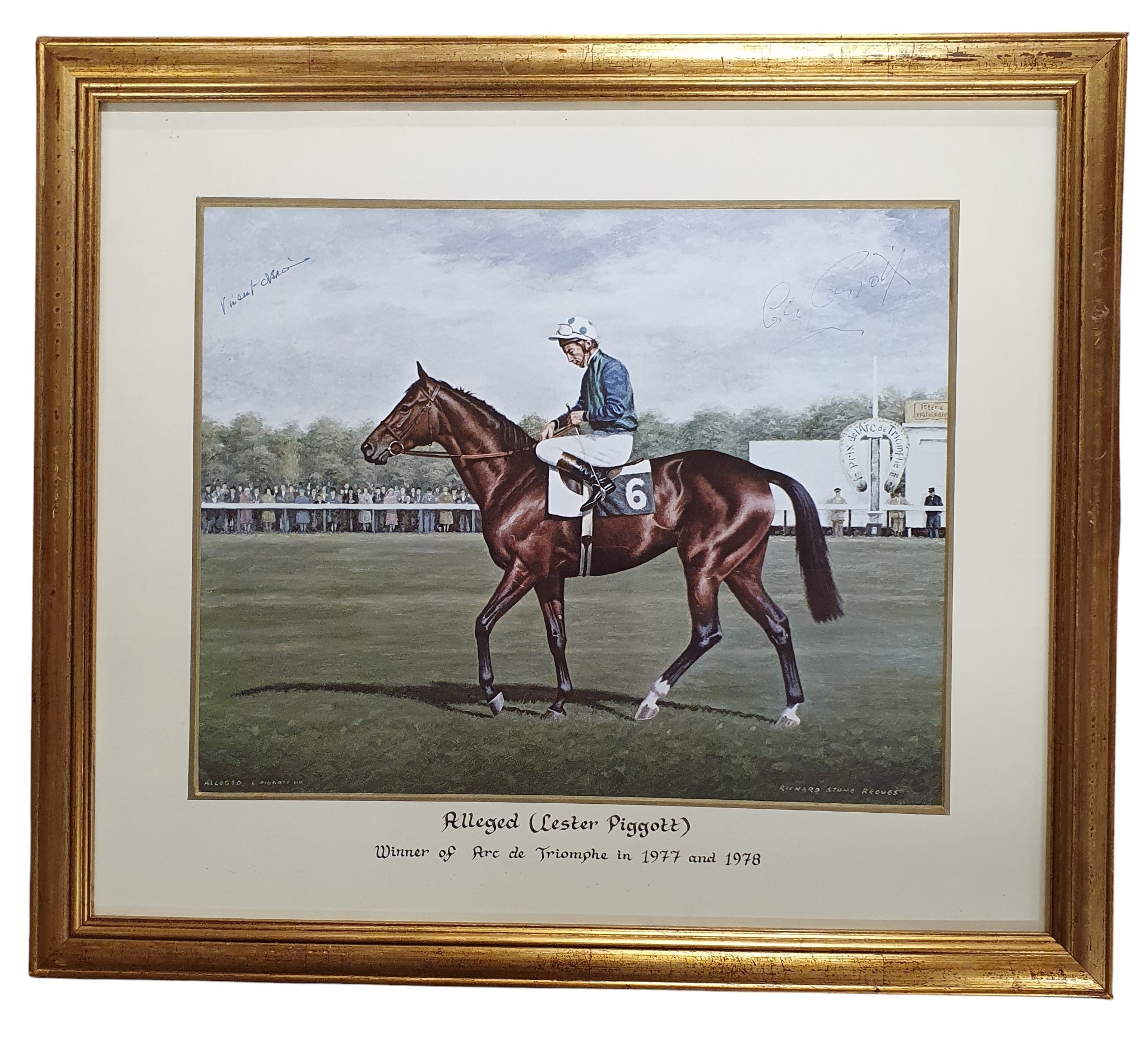 After Richard Stone Reeves, a coloured Print of Alleged and Lester Piggott up, winner of The Arc de Triomphe in 1977 & 78.