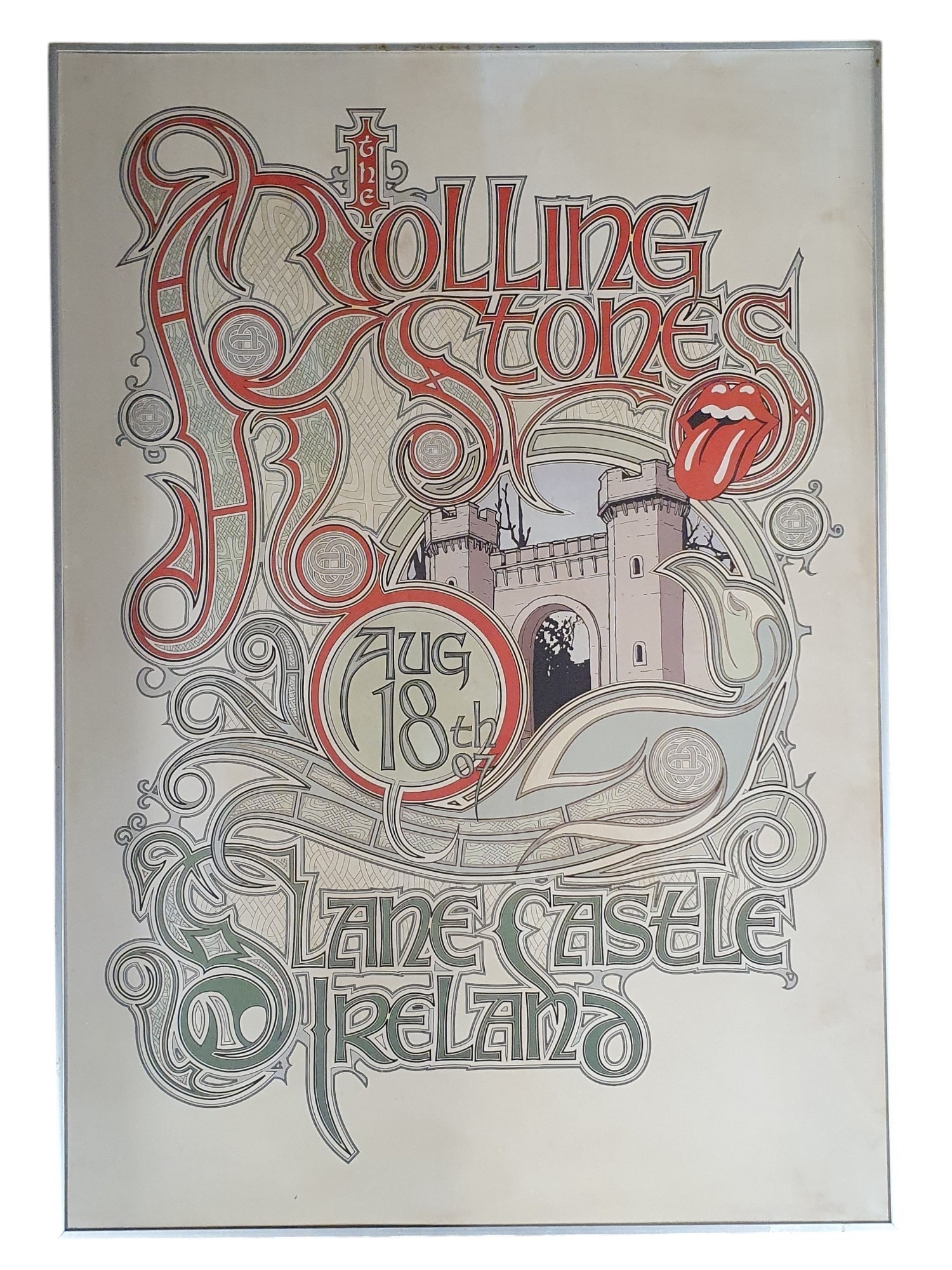 A large framed Poster print of the Rolling Stones at Slane castle 1987.H 101 x 71 cm approx.
