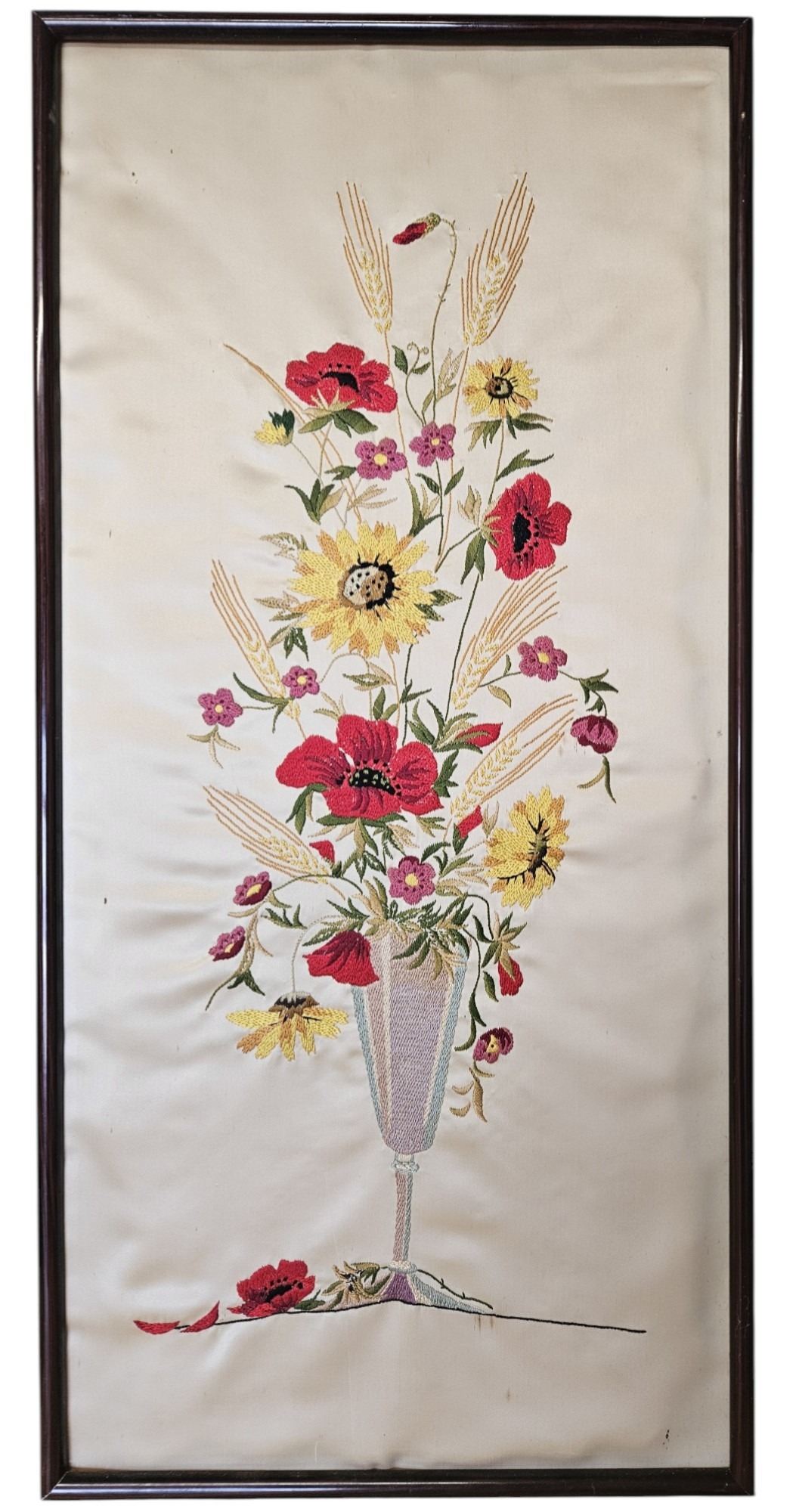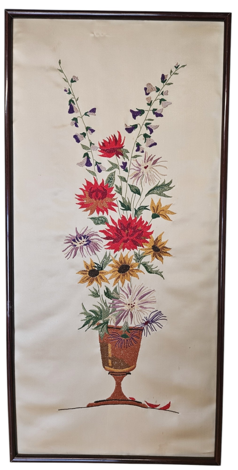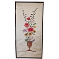 A pair of early 20th Century needlework on Silk Panels Still Life of Flowers in a vase on a table setting. 77 x 38 cm approx.