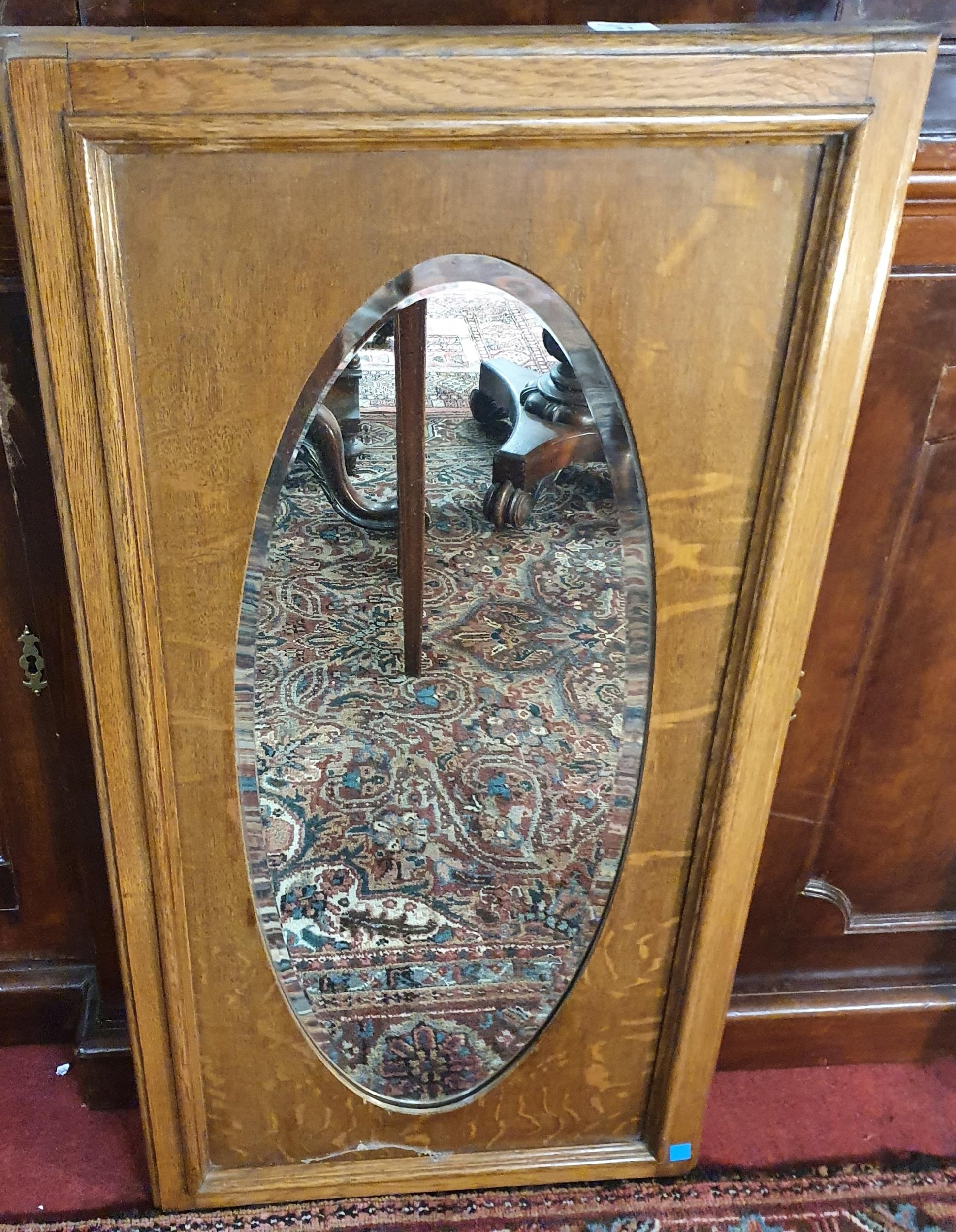 An early 20th Century Oak mirror with oval bevelled glass. 50 x 48 cm approx.