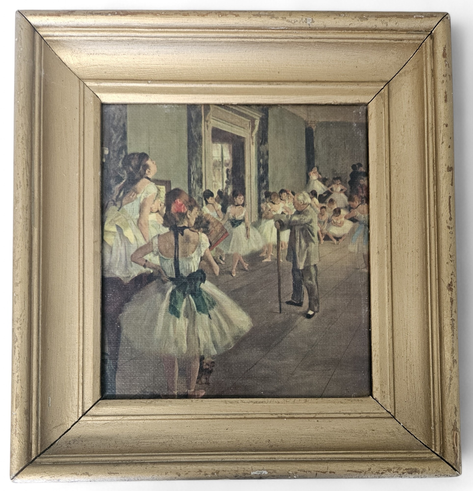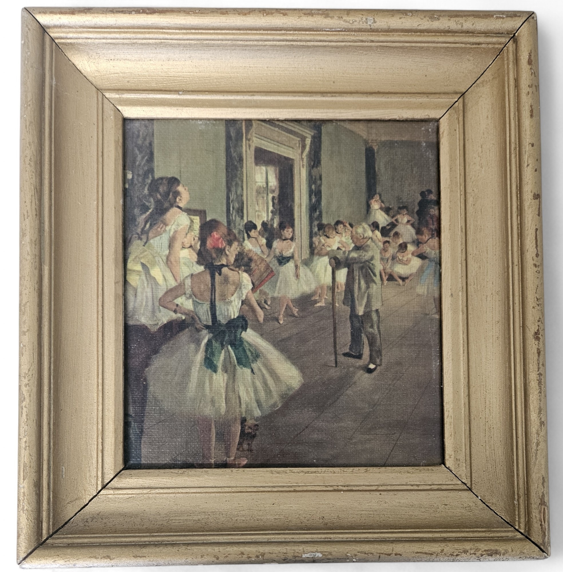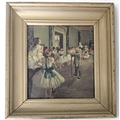 After Degas' Ballet Dancers. An Oleograph on Canvas of Ballet Dancers in a gilt frame. 22 x 20 cm approx.