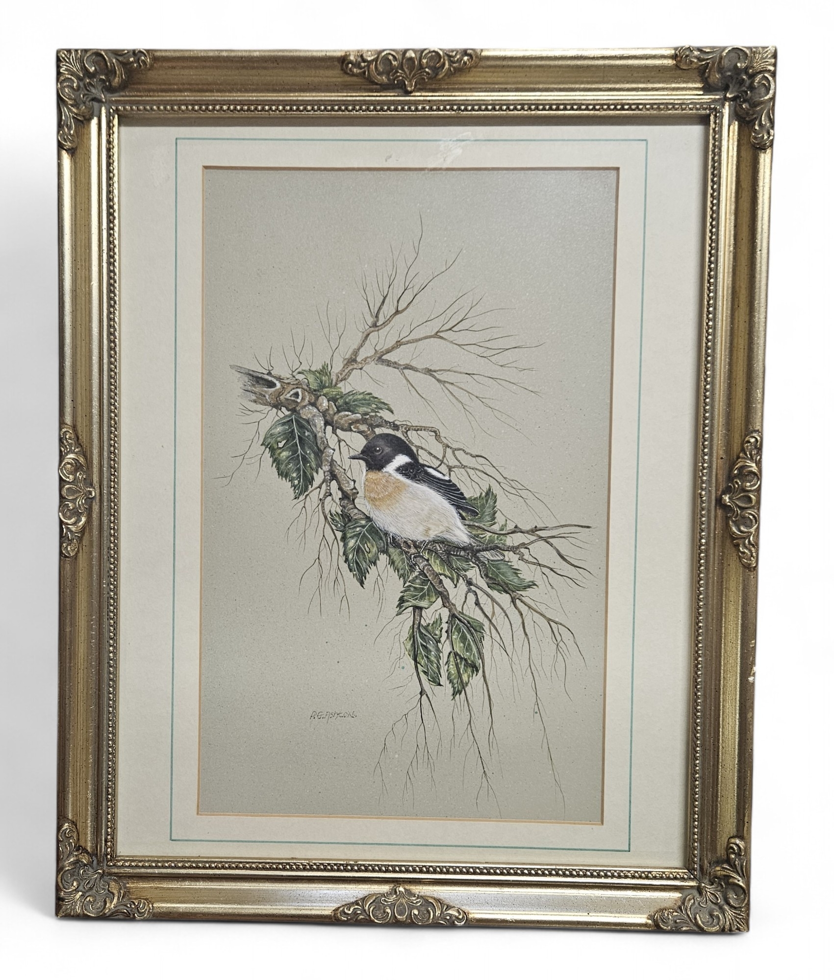 R.G Ashton. A 20th Century Watercolour of a bird on a branch. In a good gilt frame. Signed LL 31 x 21 cm approx.